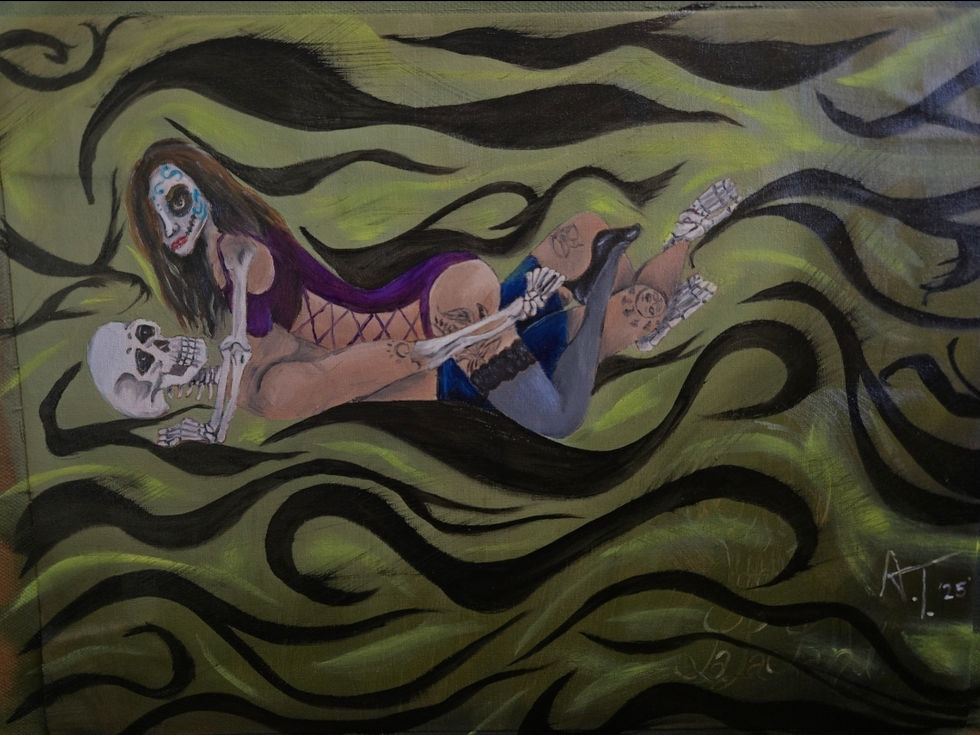 A collection of vibrant and unique skeleton-themed paintings, featuring a variety of colorful backgrounds and artistic styles.